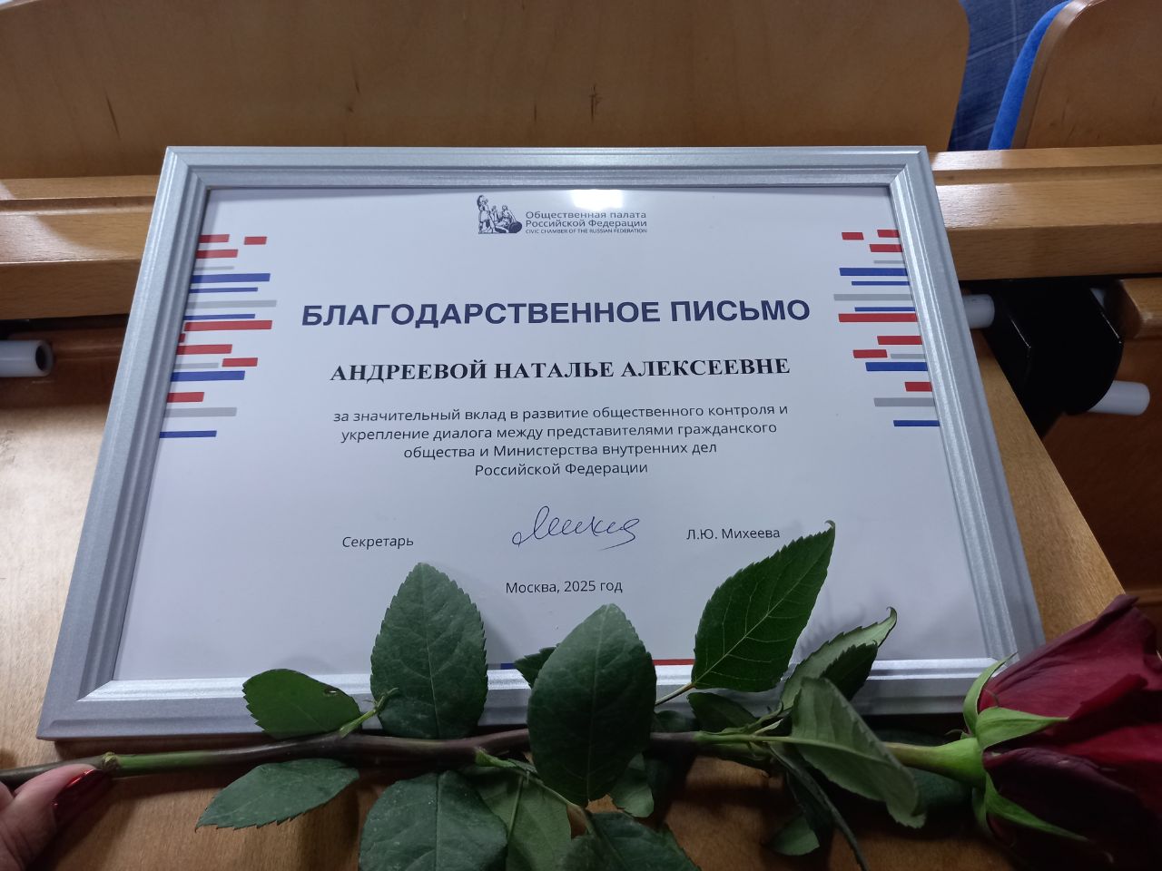По итогам мероприятия Наталье Андреевой было вручено благодарственное письмо. Эта награда стала признанием ее существенного вклада в совершенствование общественного контроля и укрепление партнерских отношений между гражданским обществом и Министерством внутренних дел Российской Федерации.