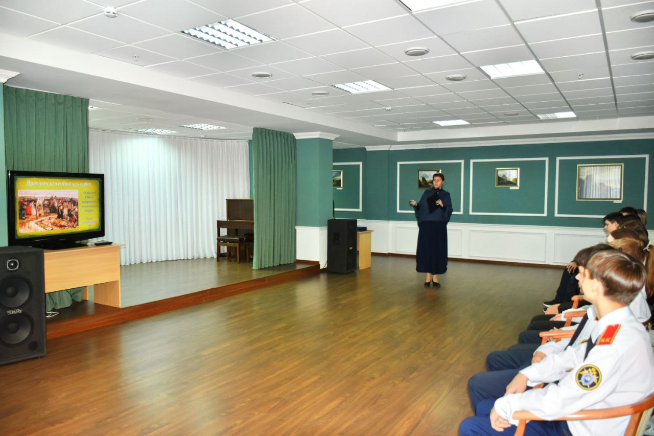 Работники библиотеки подготовили презентацию, совершив со школьниками экскурс в историю России, вспомнив о самых великих войнах и сражениях, в которых участвовала наша страна, о трагических потерях, лишениях и тяготах, которые испытывало мирное население в военное время, о необходимости сохранения памяти о подвиге каждого солдата.