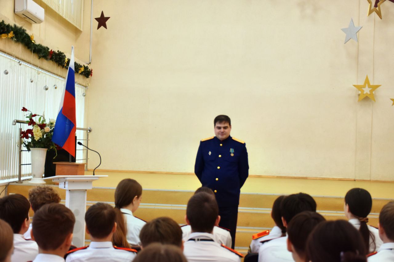 Руководитель второго отдела по расследованию особо важных дел следственного управления Корчагин Д.П. поздравил кадет с этой знаменательной датой, пожелав успехов в учебе, развития своих творческих способностей и правильного выбора в будущем своей профессии. Рассказал об истории создания СК России, основных направлениях деятельности следственного управления, сложной и интересной работе следователя.