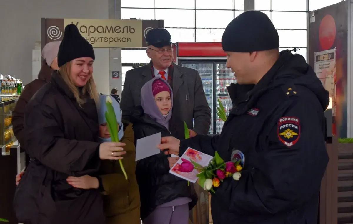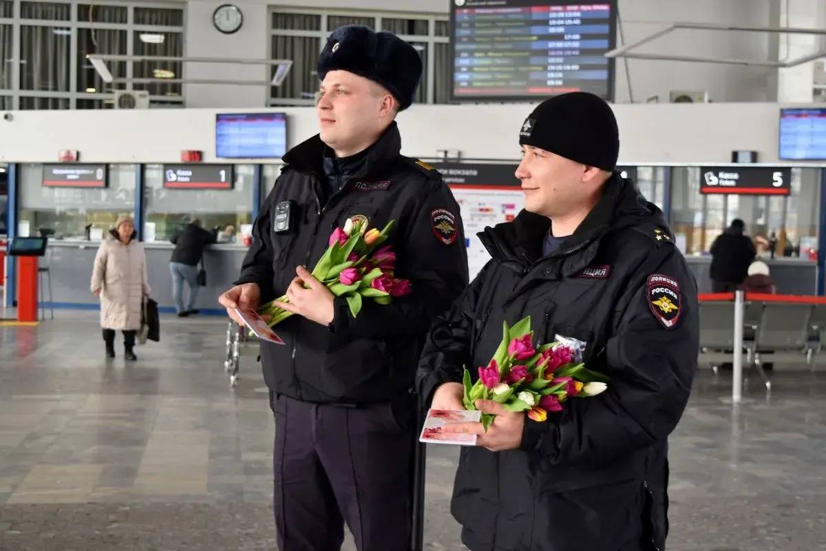 Не остались без внимания полицейских пассажиры поездов и работницы транспортной магистрали. На железнодорожном вокзале сотрудники патрульно-постовой службы полиции линейного отдела в рамках акции «8 Марта – в каждый дом», где поздравили женщин, прибывающих и убывающих с железнодорожного вокзала и подарили цветы.