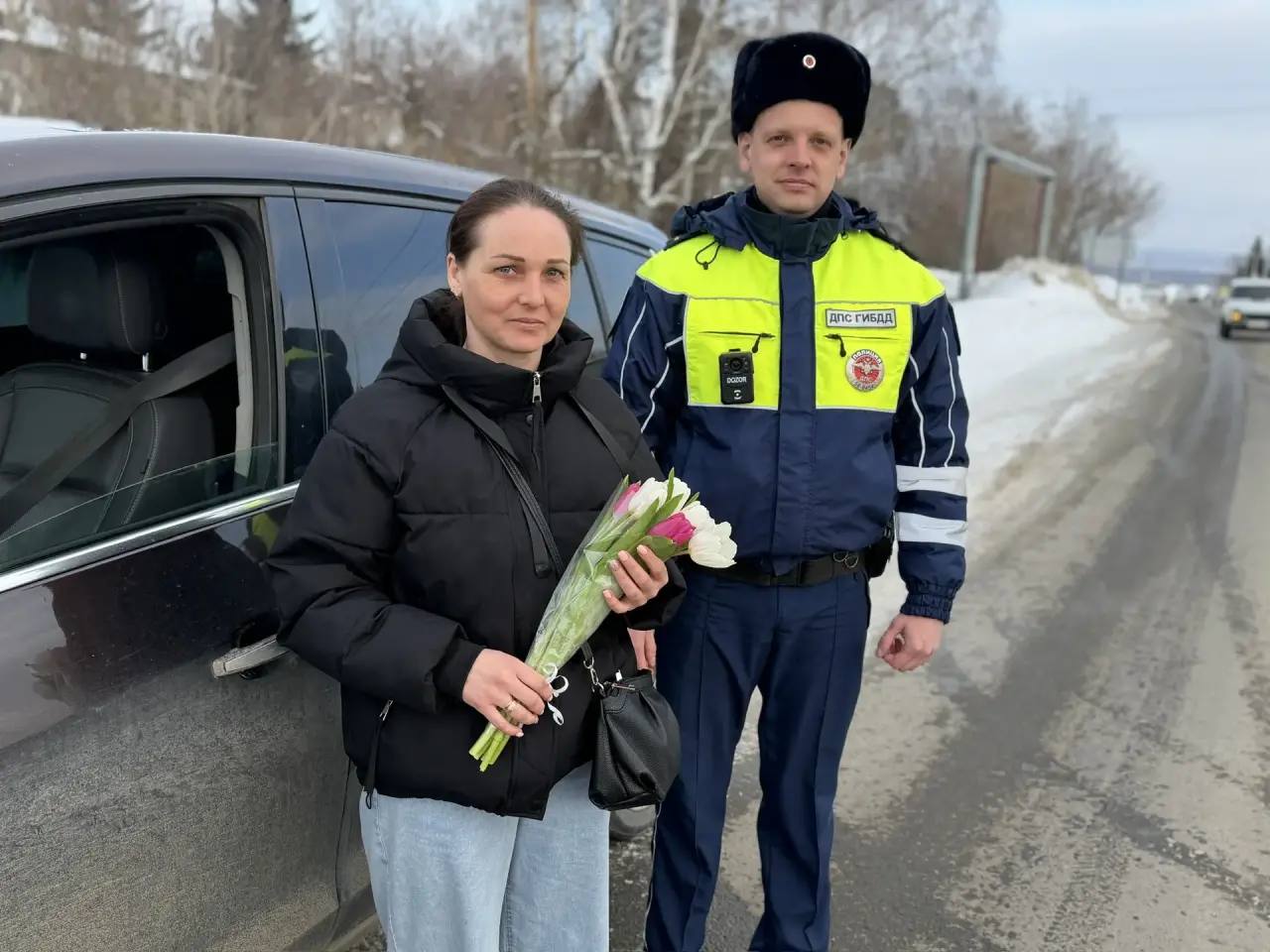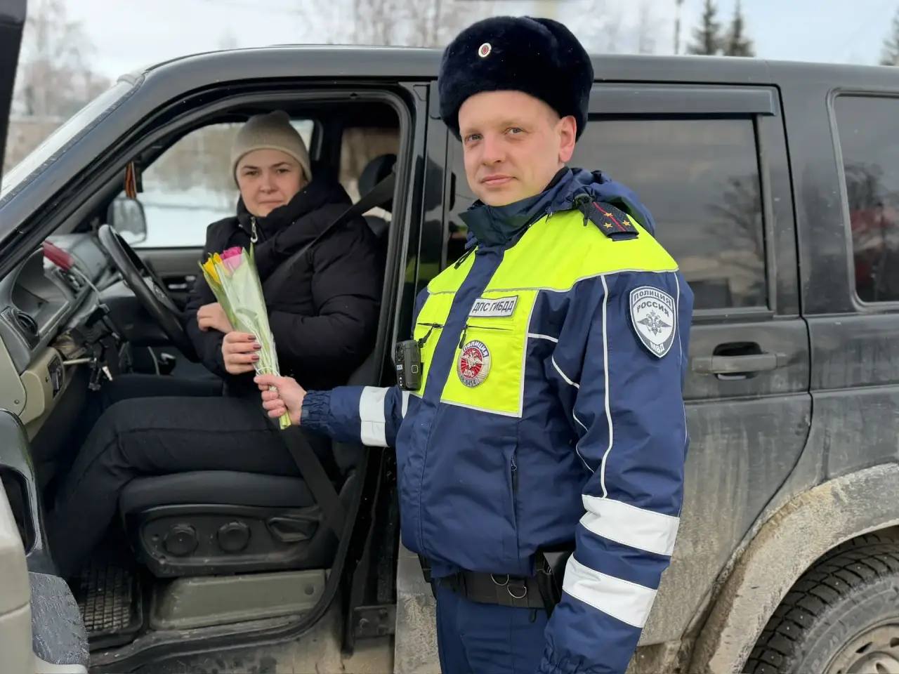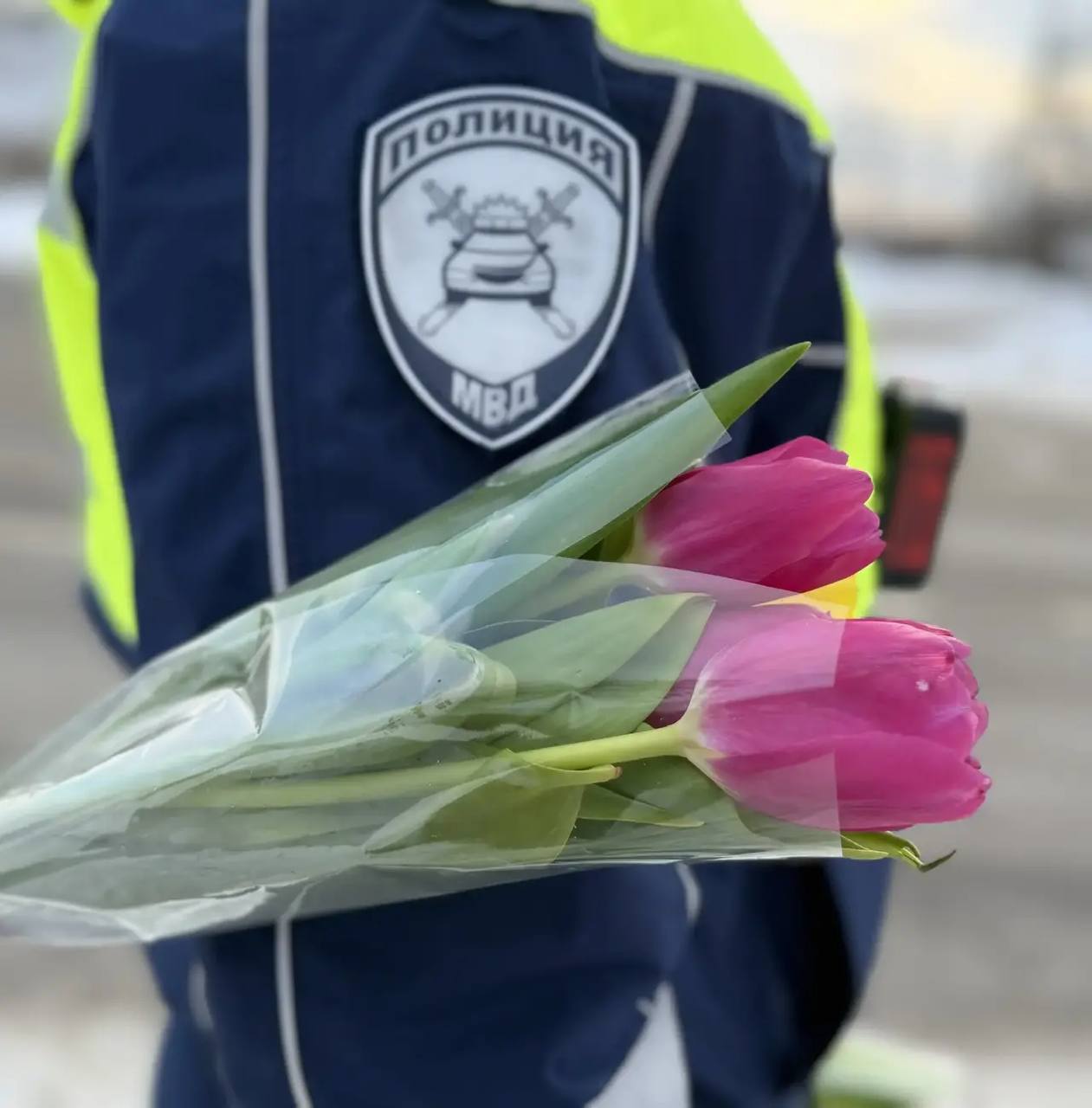 В преддверии праздника инспекторы вышли на дорогу, чтобы лично поздравить каждую женщину за рулем.