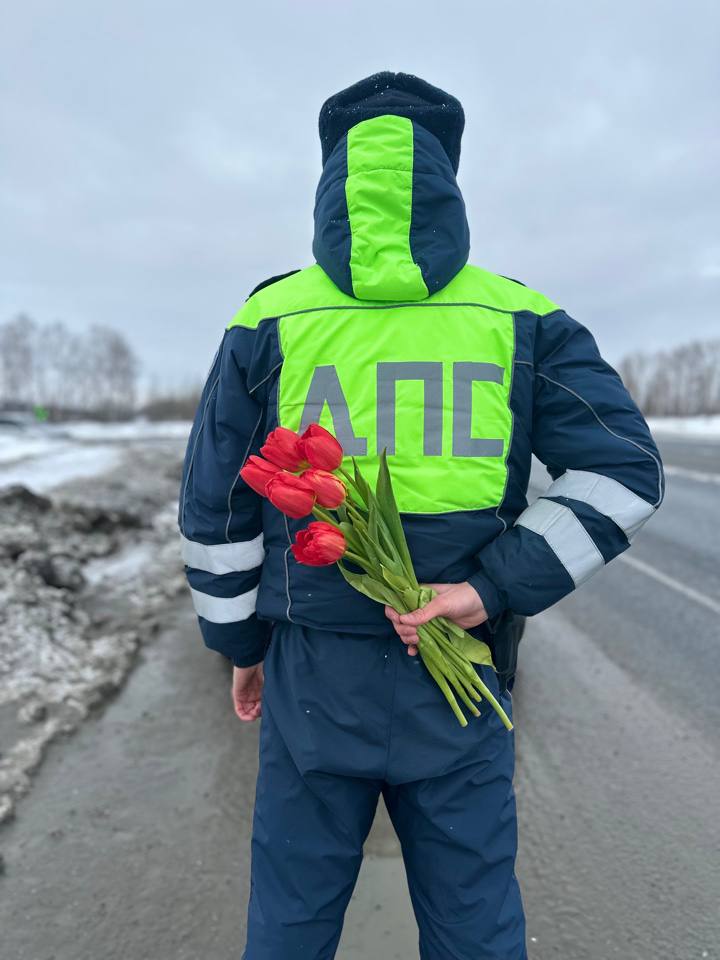 8Марта — день сюрпризов, и даже обычная проверка документов на дороге может обернуться приятным поздравлением! Лёгкое беспокойство при виде жезла инспектора мгновенно исчезало, когда автоледи замечали в руках полицейских… тюльпаны!