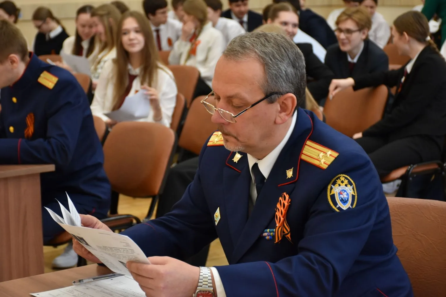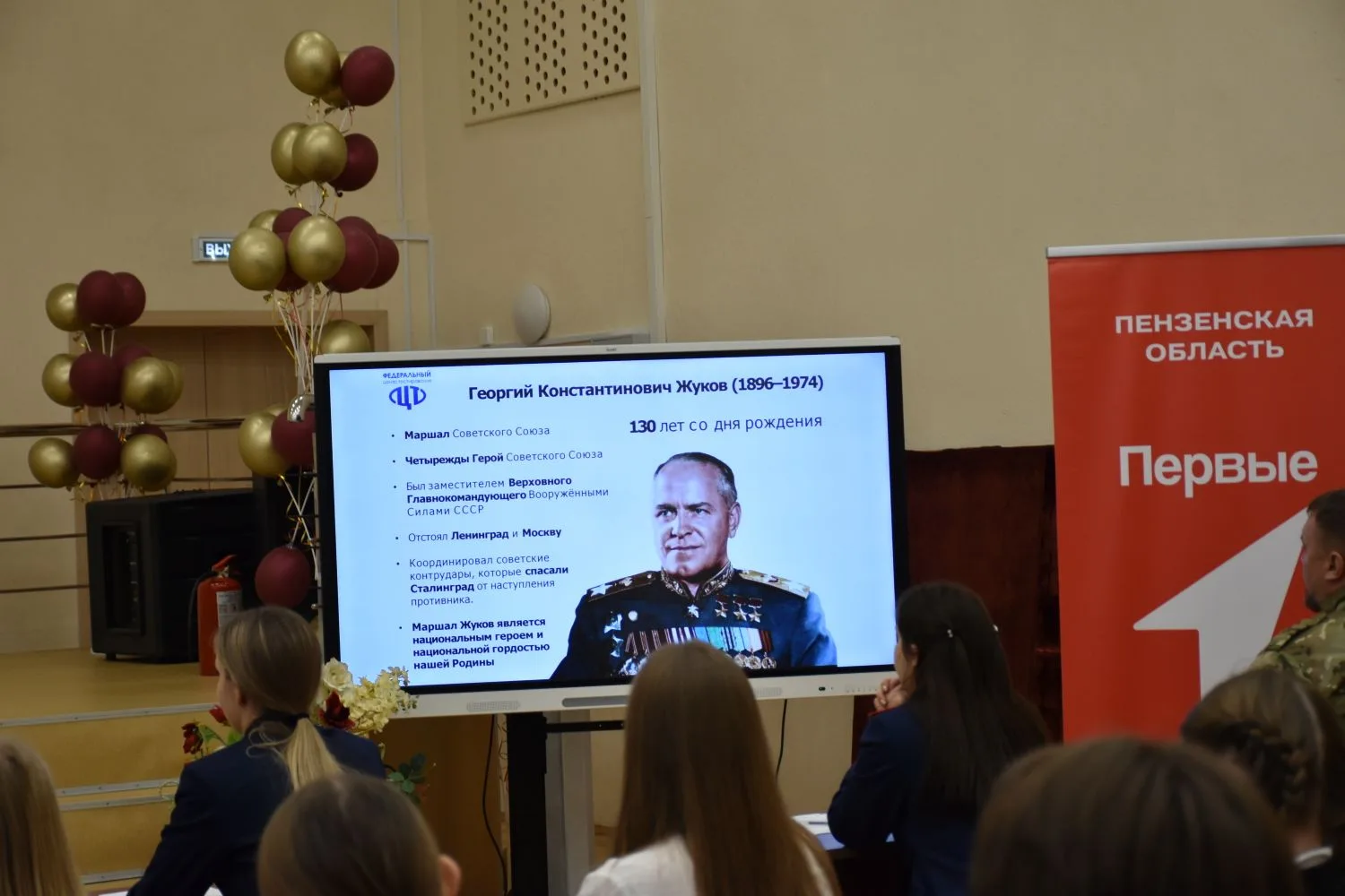 Сотрудники следственного управления СК России по Пензенской области на базе средней общеобразовательной школы № 36 города Пензы вместе с участником специальной военной операции Солдатовым А.В. и учащимися старших классов отвечали на вопросы, посвященные 130-летию Маршала Советского Союза Г.К. Жукова и героям специальной военной операции.