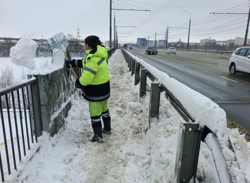 Силами 152 дорожных рабочих вручную от снега убираются территории около остановочных павильонов, подходы к пешеходным переходам, узкие участки тротуаров, лестницы.