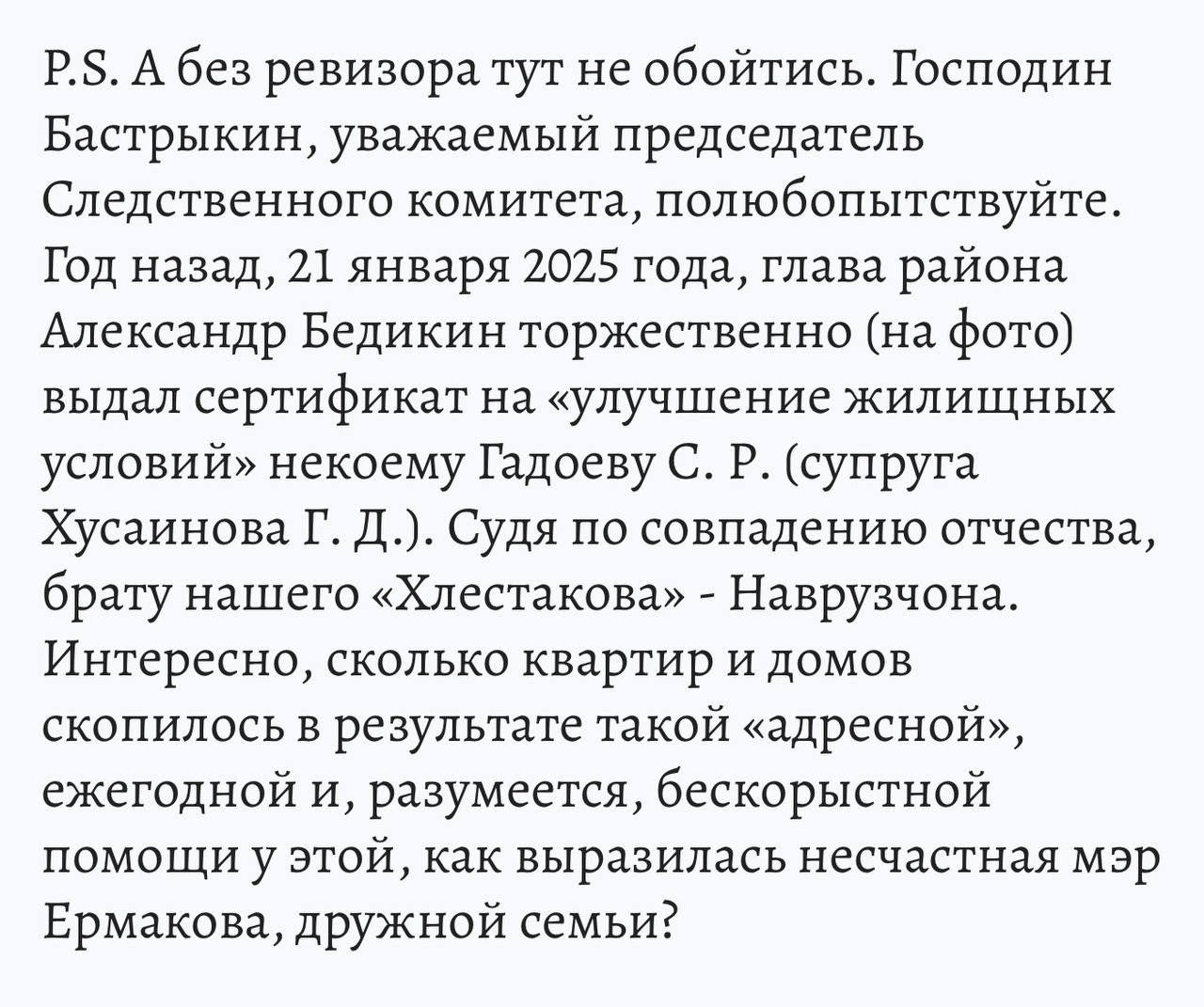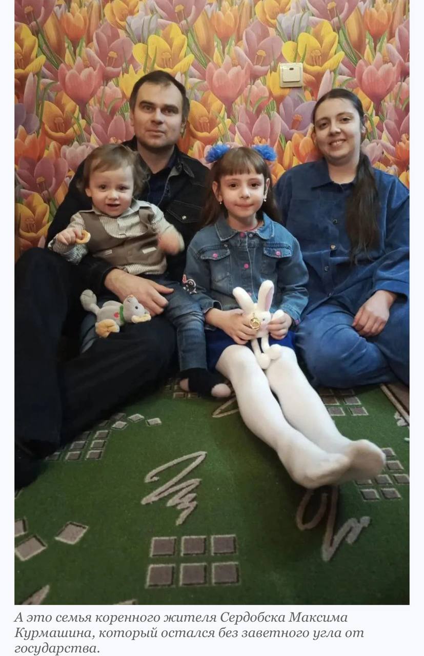 Кстати, коренные жители Сердобска гораздо менее удачливы. Например, семья Курмашиных, которую нагло отодвинули в очереди из-за Гадоева, фактически лишилась права на приобретение жилья по сертификату. В следующем году супруги не смогут участвовать в соцпрограмме по возрасту, пишет Telegram-канал «Многонационал».