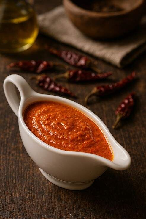 Этот соус прекрасно подходит не только для картошки и рыбы, но и для мяса, сыра или как намазка на хлеб. Для начала необходимо залить сушёные перцы кипятком и оставить на 15 минут. Затем следует слить воду и аккуратно обсушить перчики с помощью бумажного полотенца. Чтобы добиться более мягкой консистенции и уменьшить остроту, желательно удалить семена.