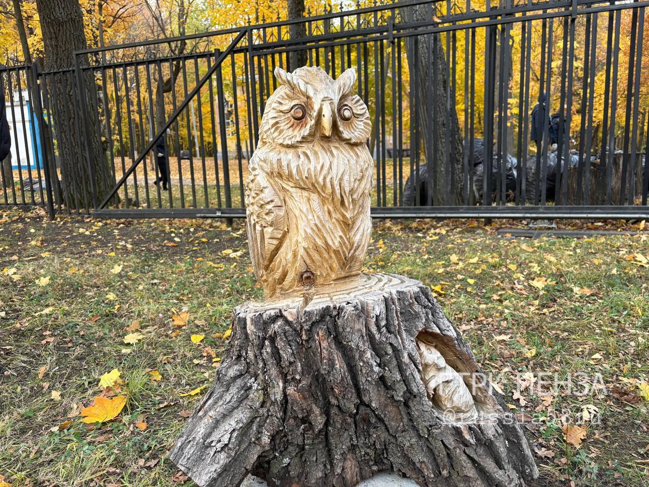 На въезде свое место заняла деревянная сова, подаренная гостелерадиокомпании создателем парка "Древландия" Сергеем Богомоловым.