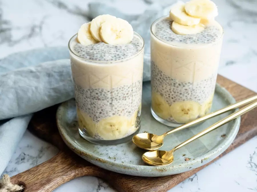 Затем нарезанные бананы располагаются вдоль стенок стакана или другой ёмкости, в которой будет подаваться десерт. Сначала выкладывается слой чиа-пудинга, за ним следует фруктовое пюре. Не забудьте оставить немного пудинга для последнего слоя. Готовый десерт можно украсить кусочками банана. Для идеального результата блюдо оставляют в холодильнике не менее чем на час.