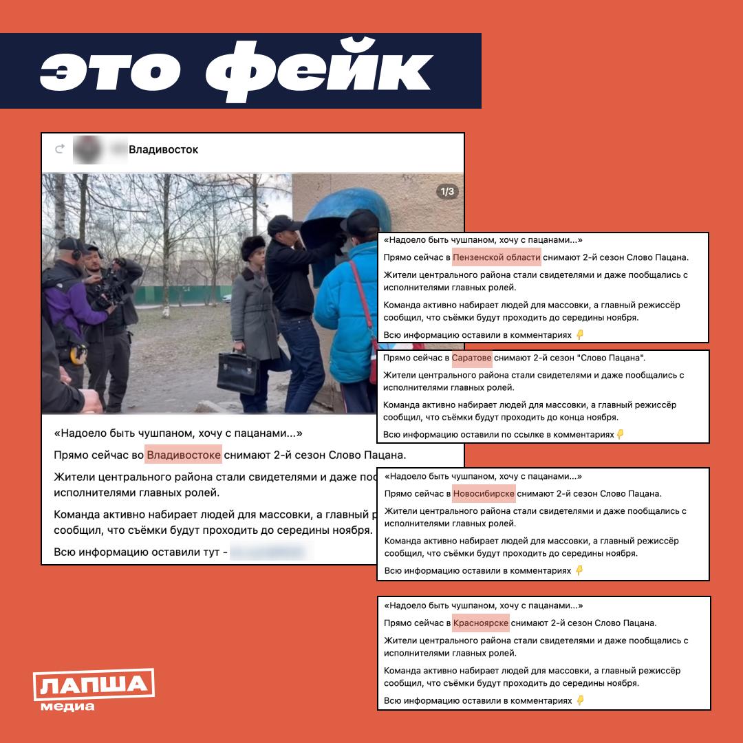 На фейк указывает и то, что все съемки проходят одновременно и в разных географических зонах. «Лапша Медиа» еще с конца 2023 года неоднократно опровергала начало съемок сериала в городах России, однако авторы каналов продолжают спекулировать на этой теме.