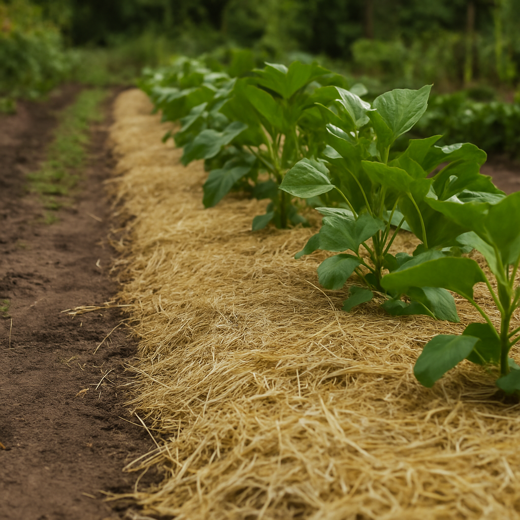 - Мульчирование. Укрытие грядок соломой, травой или компостом весной и осенью образует защитный слой, сохраняющий влагу и питание для растений.