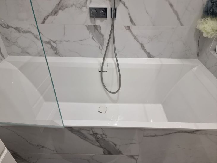 Смойте водой. Промойте ванну тёплой водой и протрите насухо микрофиброй для блеска.
