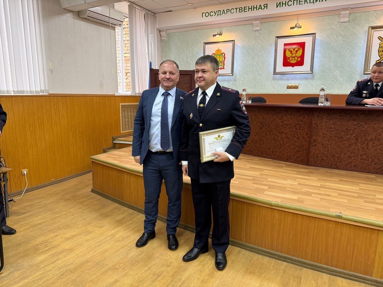 Парламентарий встретился с представителями регионального управления Государственной инспекции безопасности дорожного движения МВД России, поздравил автоинспекторов с праздником и вручил Почетные грамоты губернатора Пензенской области заместителю начальника МРЭО ГИБДД г. Пензы Сергею Лопатинскому и руководителю МРЭО ГИБДД г. Городище Александру Бакалину.