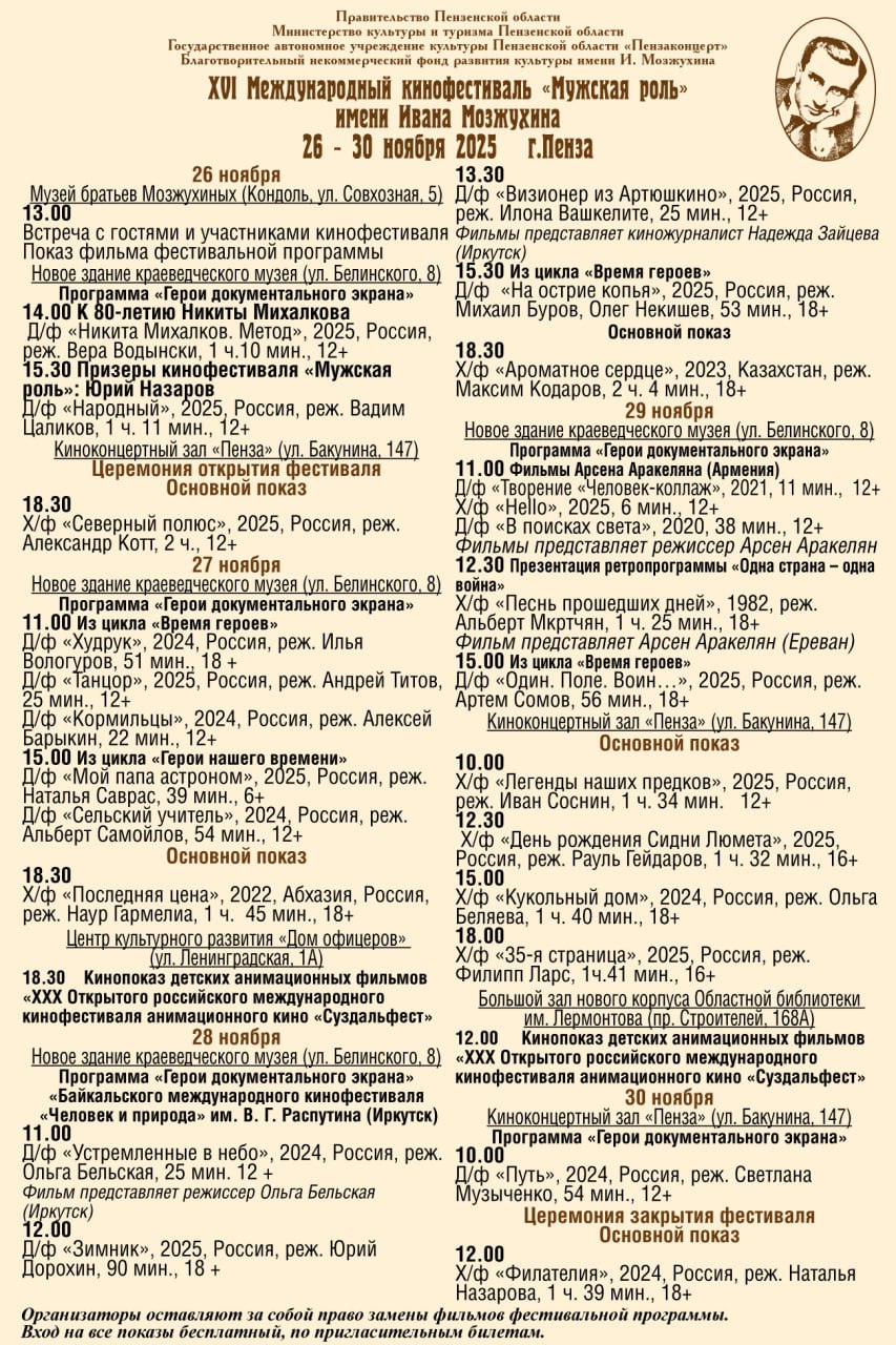 XVI Международный кинофестиваль «Мужская роль» имени Ивана Мозжухина пройдет с 26 по 30 ноября при поддержке губернатора региона Олега Мельниченко. По традиции церемония открытия пройдет 26 ноября на родине великого киноактера – в Кондоле, в музее братьев Мозжухиных.