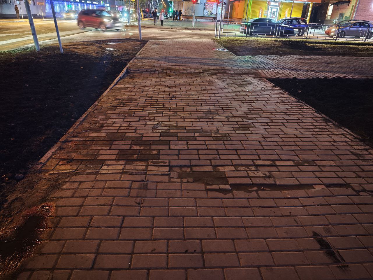 На этом участке долгое время вели ремонтные работы ресурсники. Некоторое время основная яма у дороги была заброшена. Потом ее наконец закопали, но дорожку долго не восстанавливали. Когда плитку все-таки уложили, она тут же просела. Коммунальщики переделали работу, однако результат оказался недолговечен.