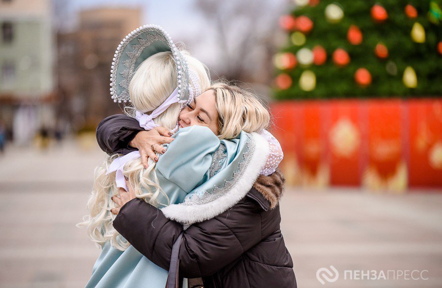 В процессе прогулки по центру города ей удалось запечатлеть и процесс общения пензенцев с зимними сказочными персонажами – Дедом Морозом и Снегурочкой, которые заряжали всех прохожих праздничным настроением, дарили теплые объятия и улыбки.
