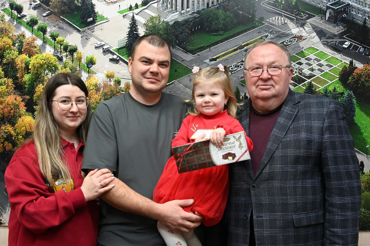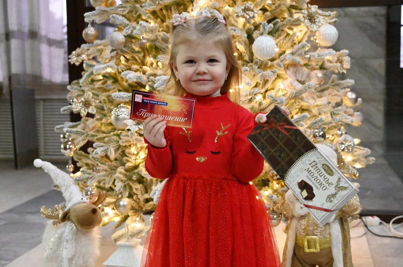 Заместитель главы администрации города Сергей Волков вручил подарок представителю одного из победителей первого этапа нашего новогоднего марафона