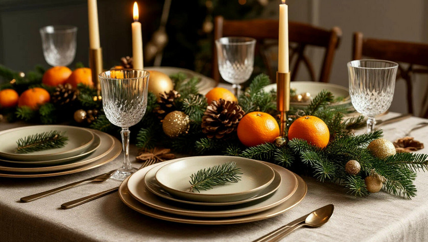 Основное впечатление от стола формирует скатерть или дорожка. Избегайте ярких синтетических тканей с громкими новогодними рисунками. Лучше выбрать скатерть из натуральных материалов, таких как лен или хлопок, в спокойных тонах: кремовом, сером, темно-зеленом или бордовом. Для добавления текстуры можно использовать яркую дорожку поверх однотонной основы. Эта базовая деталь объединит остальные элементы, создавая гармоничную композицию.