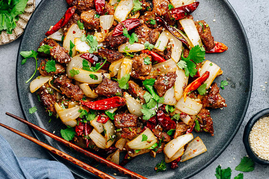 Перед началом жарки слейте излишки маринада с ягнятины, добавьте крахмал и снова аккуратно перемешайте. На сковороде разогрейте растительное масло, выложите кусочки мяса в один слой и обжаривайте до румяности с обеих сторон (около 1-2 минут). После этого добавьте оставшиеся ингредиенты: обжаренный лук, чеснок, имбирь и специи, перемешайте, чтобы все вкусы соединялись и подавите на огне еще 30 секунд.