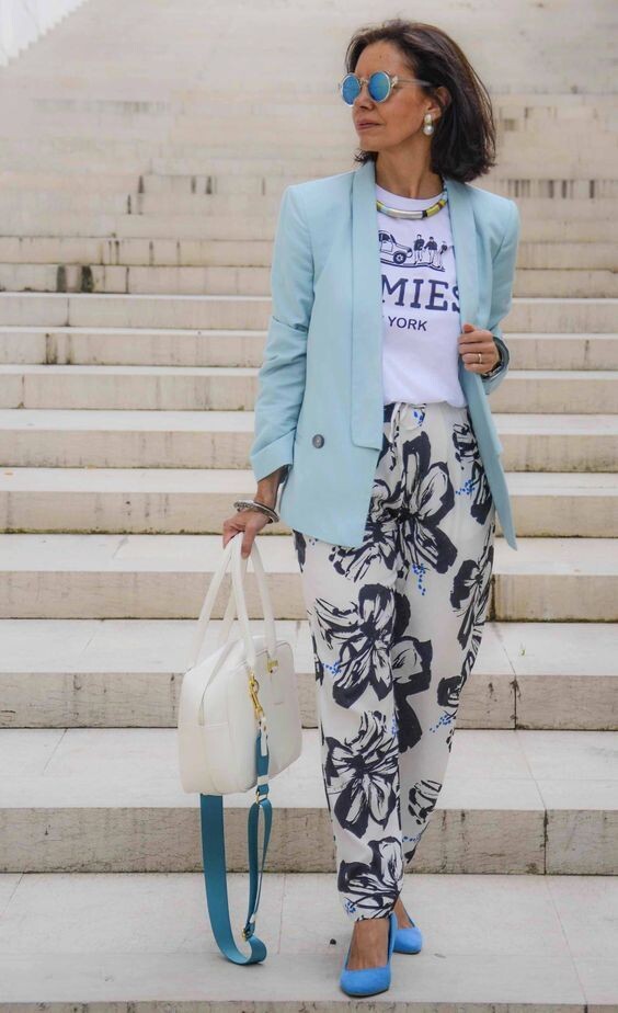 - Летний ансамбль: Легкие, светлые брюки с цветочным принтом можно сочетать с яркой футболкой. Прекрасным дополнением станет нежно-голубой жакет, а стиль завершают голубые туфли на невысоком каблуке и аккуратные аксессуары, такие как темные очки и белая сумка.