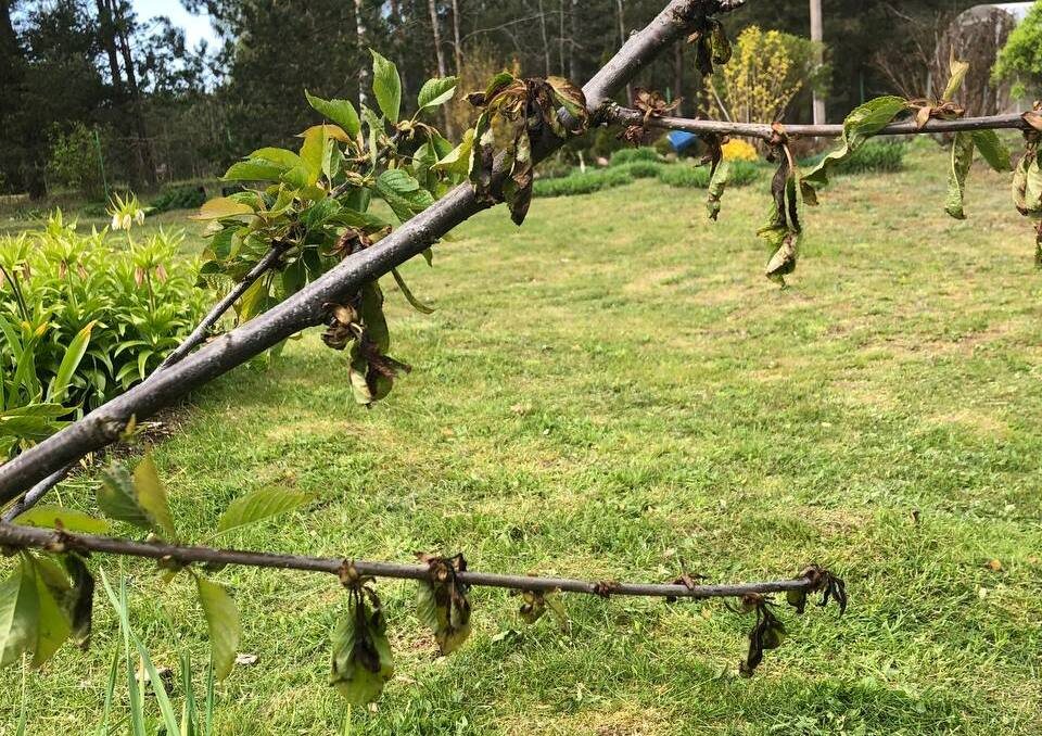 - Монилиоз: Пораженные листья и побеги резко буреют и сохнут. На коре могут появляться серые подушечки - это споры гриба.