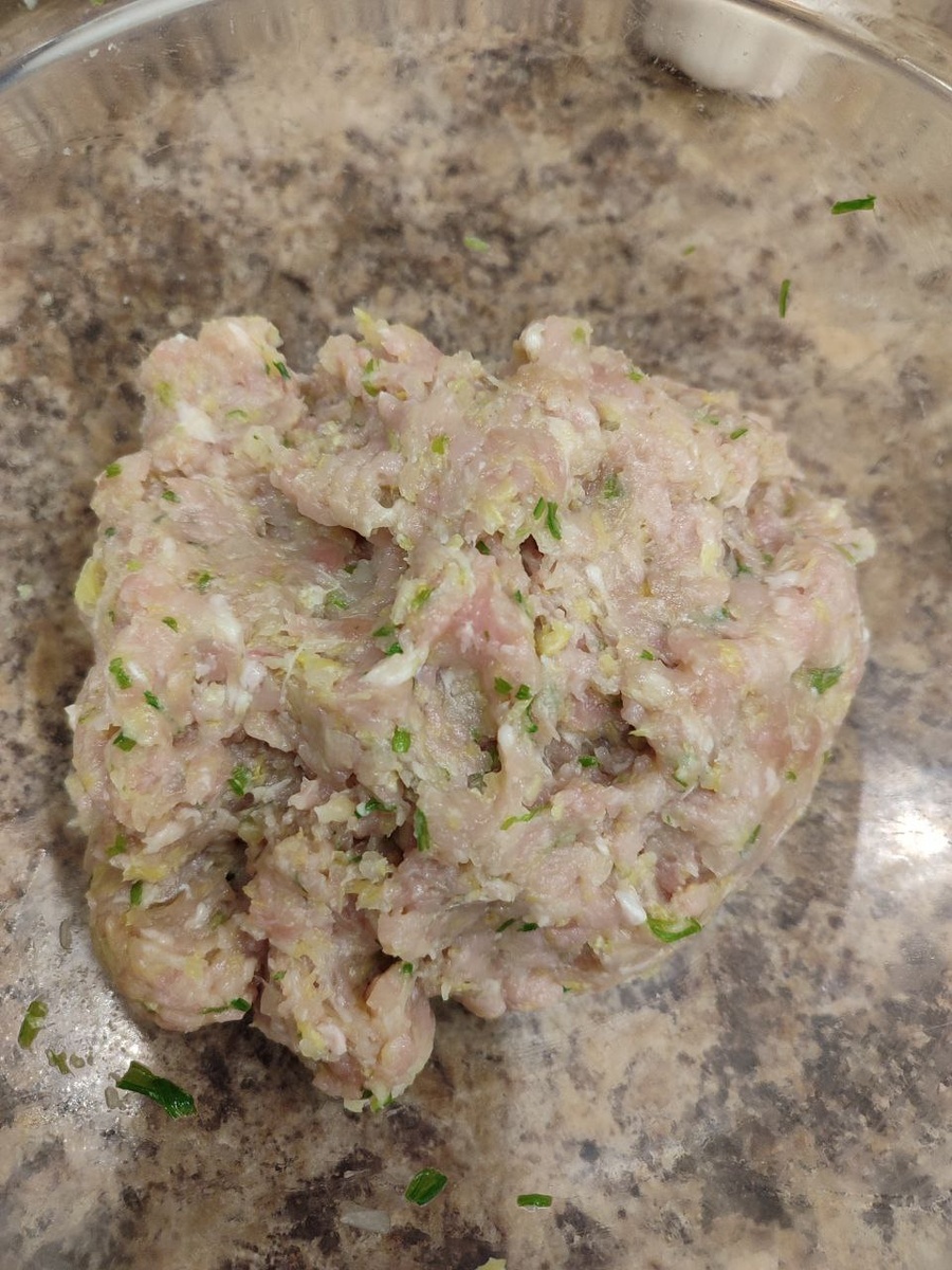 Пока тесто отдыхает, займитесь начинкой. Свинину, капусту и зеленый лук пропустить через мясорубку, добавив измельченный чеснок и соевый соус. Обязательно приправьте по вкусу солью и перцем.
