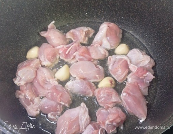 Нарежьте куриное филе небольшими кусочками. В глубоком сотейнике нагрейте оливковое масло и добавьте мясо вместе с неочищенными зубчиками чеснока. Обжаривайте на сильном огне, периодически помешивая, до появления румяной корочки — это займет около 10 минут.