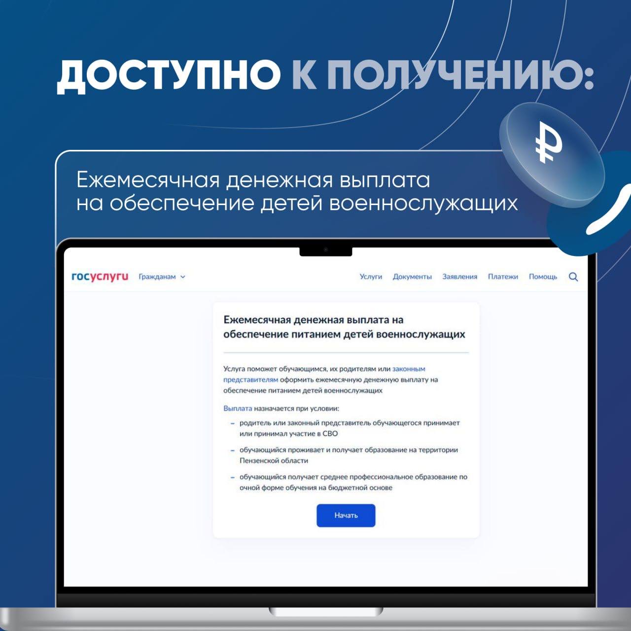 Теперь на Госуслугах можно подать заявление на ежемесячную выплату на обеспечение питанием детей военнослужащих, которые учатся очно на бюджетной основе по программам СПО в федеральных государственных учреждениях образования. Оформить выплату могут сами студенты, их родители или законные представители.