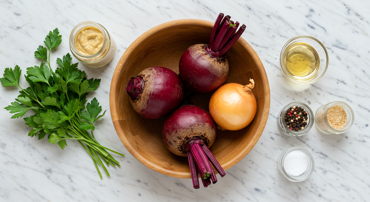 - Сахар: 3 ч. л. — раскрывает сладость свёклы и уравновешивает уксус.
