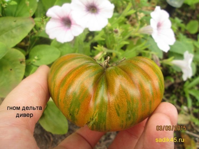 Дельта Дивер представляет собой полудетерминантный сорт, который радует своих владельцев как в открытом грунте, так и в теплицах. Отличительной чертой являются сочные красно-вишневые плоды с зелеными штрихами, достигающие веса от 80 до 300 граммов. Среднеспелость этого сорта позволяет считать его оптимальным для большинства регионов.