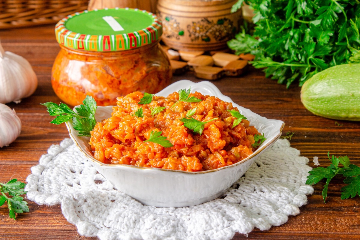 Классика, где овощная концепция добавляет сладость и глубину вкуса. Томатная основа делает икру довольно густой, а чеснок добавляет пикантность на завершающей стадии.