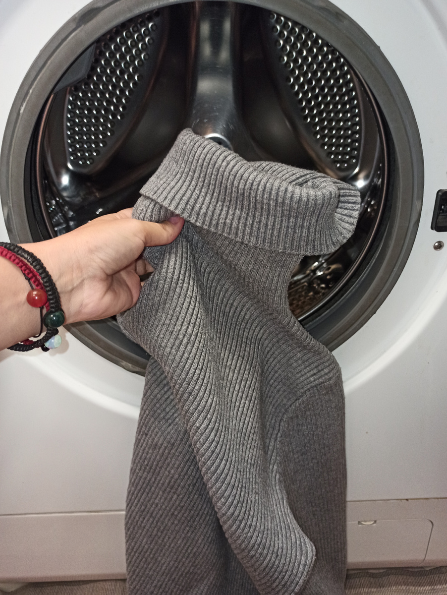Чтобы свитер не сел снова, бережная обработка важна. Температура воды должна быть тёплой или холодной, особенно для кашемира и шерсти. В отсек для порошка можно добавить небольшое количество детского шампуня — он смягчает волокна. Перед стиркой можно замочить изделие в тёплой воде с уксусом — натуральный смягчитель и помощник против сминания.