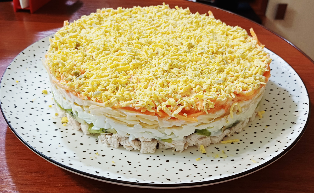 Смесь складывают слоями: курицу, киви, яйца, яблоко, сыр, морковь. Каждый слой слегка заправляют майонезом. Финальный штрих — желток, посыпанный сверху.
