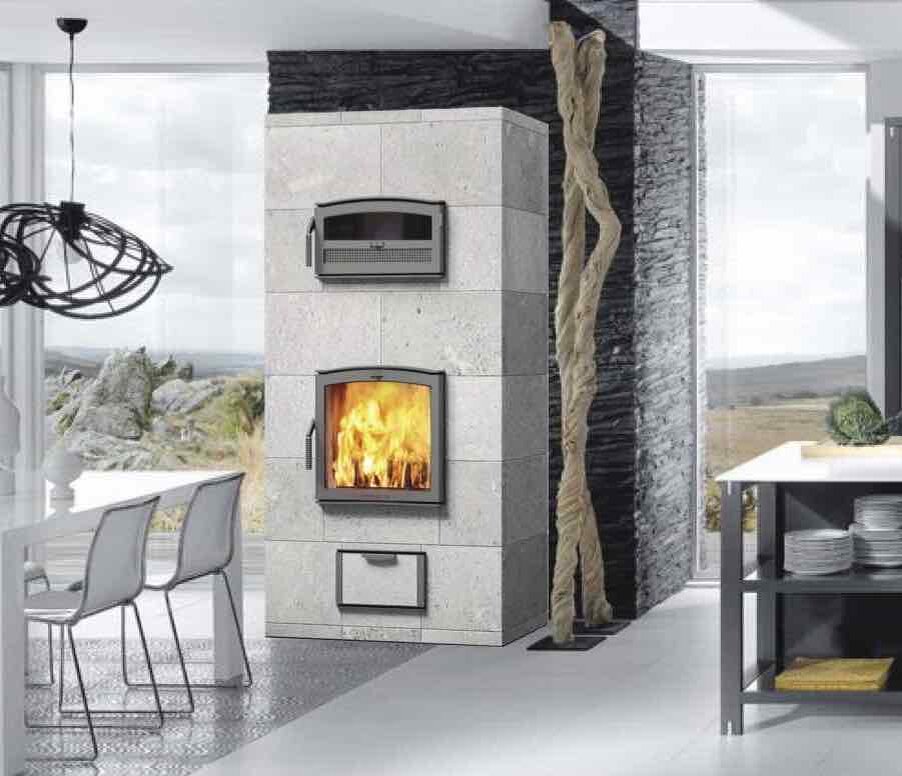 На изображении представлена элегантная модель камина из талькомагнезита, оборудованная встроенным духовым шкафом NELA SOLO.
