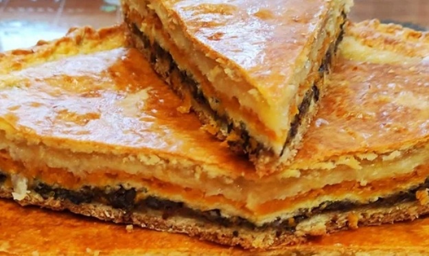 Тесто. Сначала смешивают муку с разрыхлителем и щепоткой соли. Затем добавляют холодное нарезанное масло и тщательно перемешивают. После этого вводят яйцо и сметану, замешивая тесто. Получившееся тесто делят на три части: две большие для нижнего и верхнего слоев и одну меньшую для среднего слоя. Убрать в холодильник на 30 минут.