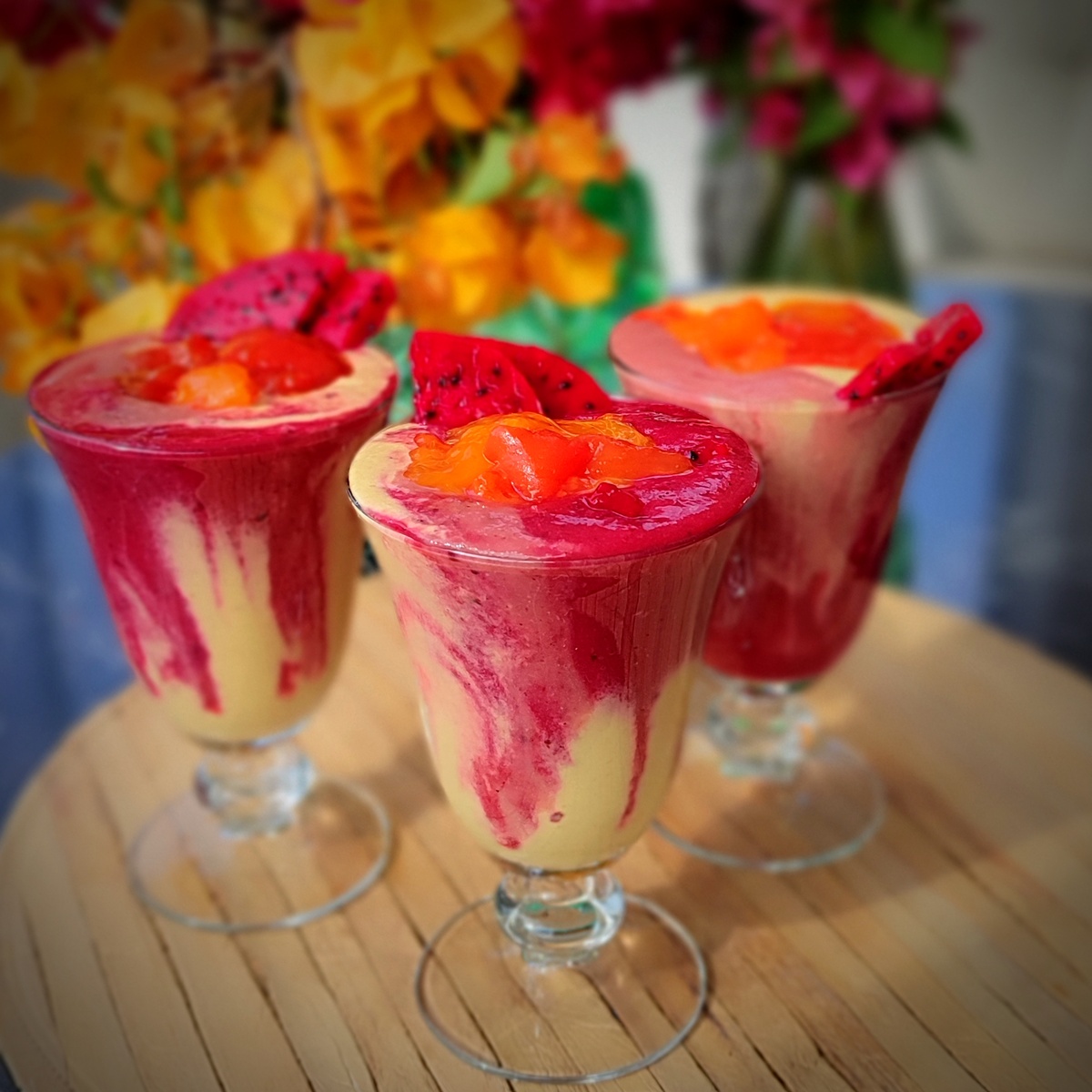 После этого полученную массу можно разлить по бокалам. Далее в блендер помещают питахайю и более твердые части хурмы, которые также перетираются до однородного состояния. Этот слой получится насыщенно фруктовым и пурпурным.