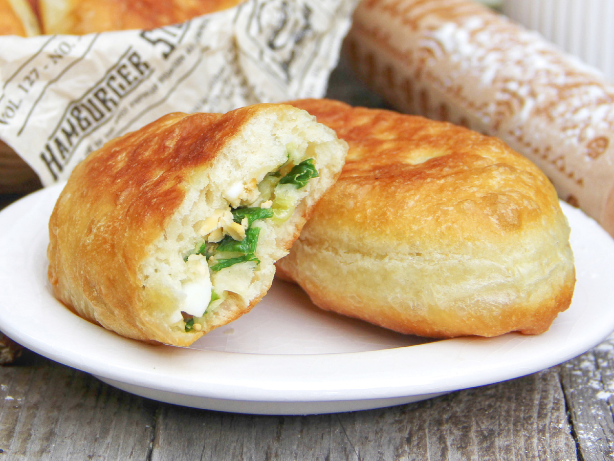 В этом необычном рецепте яйца используются только в начинке, а тесто не содержит их вовсе. Оно готовится на кефире и соде, что делает его невероятно мягким и нежным, с легкой хрустящей корочкой после жарки. Начинка состоит из традиционных ингредиентов: зелёного лука, варёных яиц и небольшой щепотки соли.