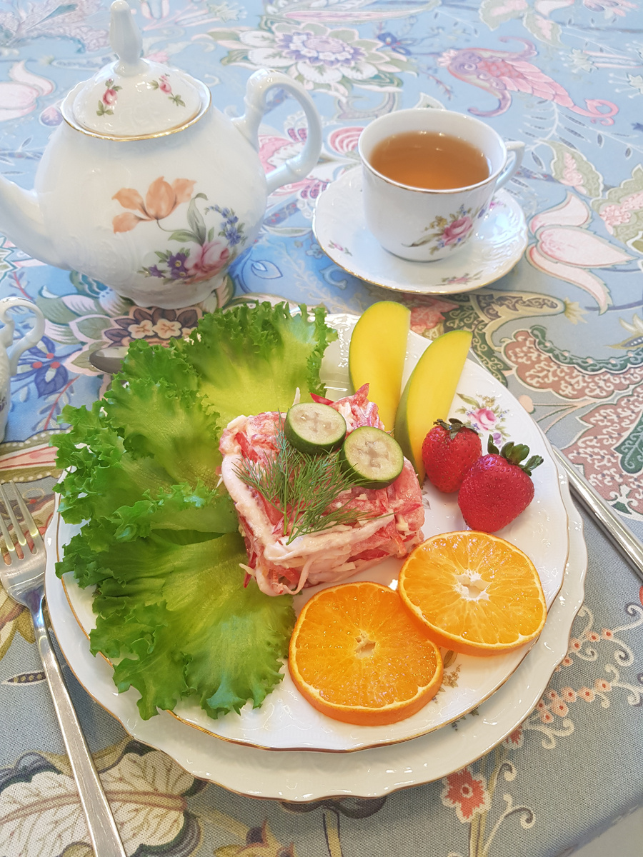 На плоской тарелке разместить промытые листья салата, а в центре с помощью кондитерской формы аккуратно выложить получившуюся салатную смесь. Чтобы придать особую утончённость, украсьте блюдо укропом, фейхоа и свежими ягодами или фруктами, такими как клубника и мандарины. Этот салат станет настоящим украшением как праздничного стола, так и романтического ужина.