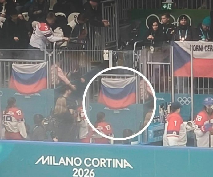 Смелый болельщик с российским триколором на трибунах Олимпиады в Италии