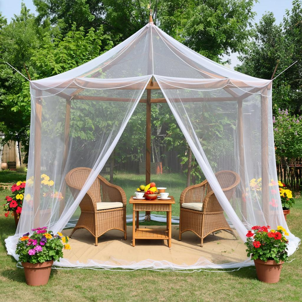 Сетка также пригодится для зонирования пространства. Легкая ширма из москитной сетки поможет отделить огород от зоны отдыха, добавляя участку изящества. Чтобы сделать ее, достаточно создать раму из брусков и натянуть сетку, украсив её лентами или цветными нитями. Даже небольшие обрезки сетки могут быть использованы для создания подсвечников или панно, что делает ее не только полезной, но и декоративной.