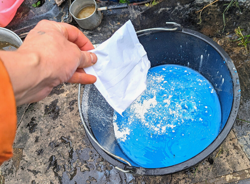 Затем аккуратно перелейте раствор из первой банки в 3 литровую емкость, предварительно процеживая его через марлю. Это поможет избавиться от крупных частиц, которые могут забивать опрыскиватель. Далее, вмешайте в получившуюся жидкость раствор медного купороса из второй банки, убедившись, что на дне не осталось осадка.