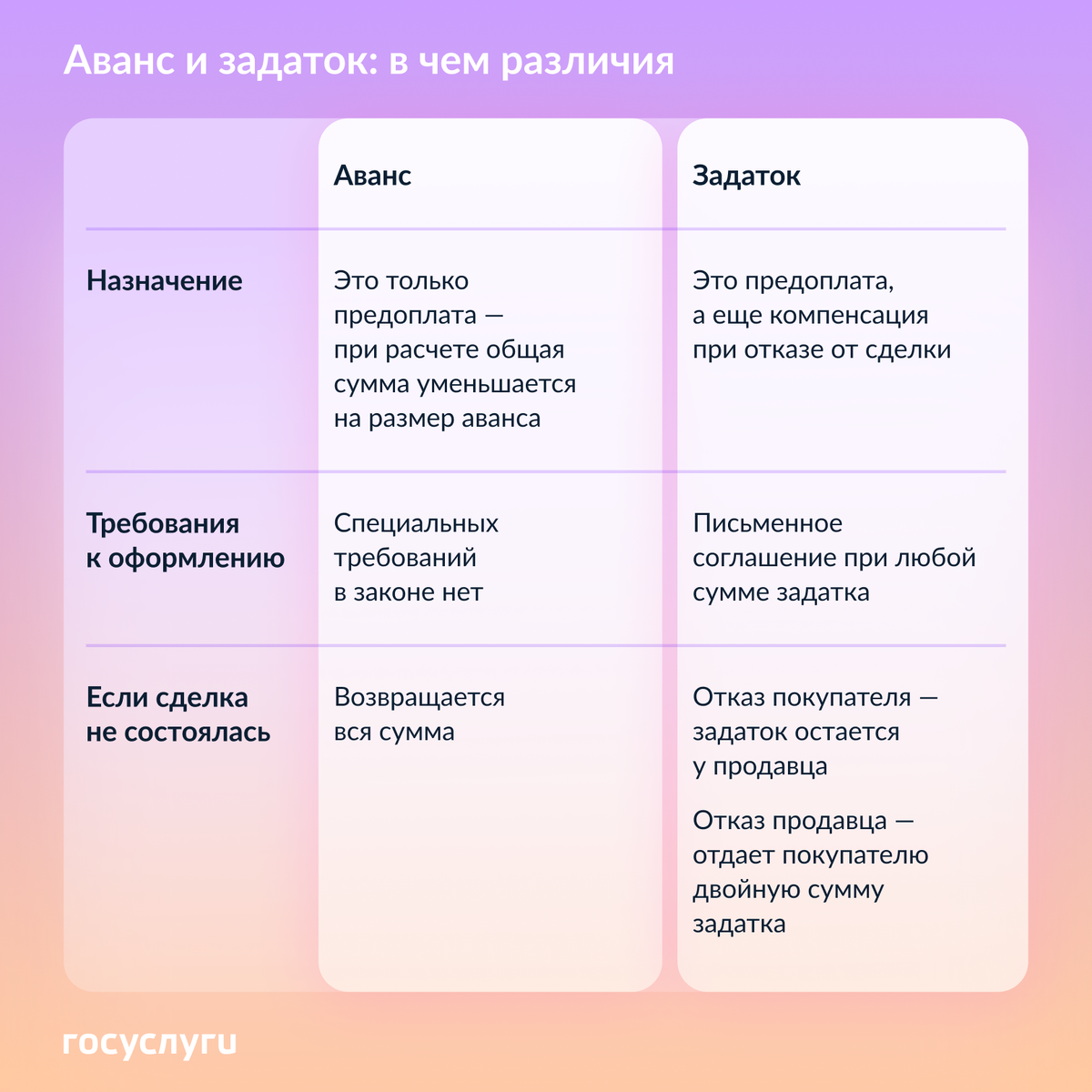 - Последствия отмены сделки — это, пожалуй, главное отличие между двумя формами предоплаты.
