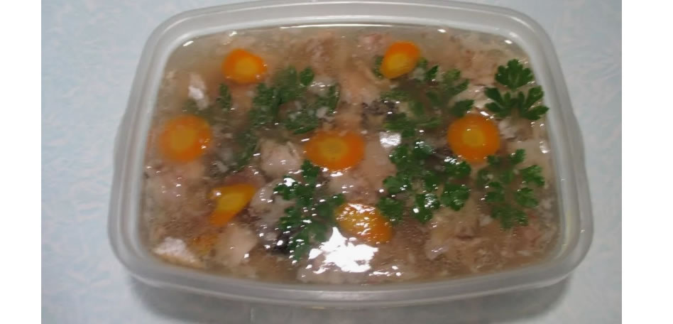 Перед заливкой бульона украсьте готовый холодец кусочками моркови, зеленью или ломтиками лимона.