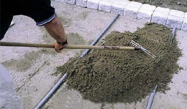 Далее следует укладка геотекстиля, который обеспечит дренаж, сохраняя при этом слой щебня в неподвижном состоянии. На подготовленное основание укладывается песчаная подушка, которая затем равномерно разглаживается, чтобы плитка оказалась немного выше необходимого уровня.