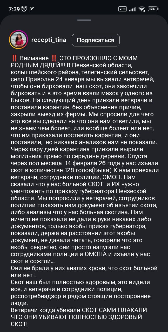 Массовое уничтожение скота в Пензенской области, часть IIПосле изъятия скота в количестве 128 голов ТУШЫ скотины валялись 2 дня просто так, около могильника, туши растаскивали дикие животные, собаки грызуны и тд. Если это опасная болезнь для...