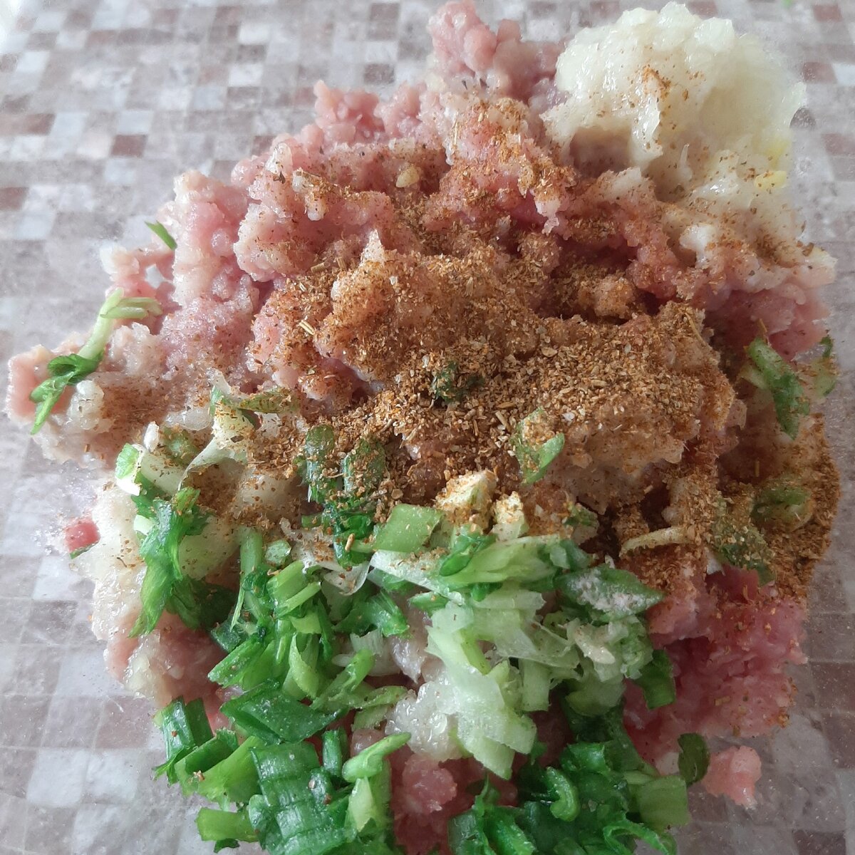 1. Готовим начинку: мелко нарезать лук и зелень, добавить к фаршу, посолить, поперчить и тщательно перемешать. Оставить на 30 минут.
