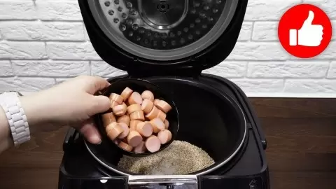 Выбор режима «Рис/Крупы» позволит добиться идеальной консистенции. Время приготовления — около 35 минут. По истечении времени каша получится не только сытной, но и очень ароматной, ведь сосиски добавят ей неповторимый вкус.