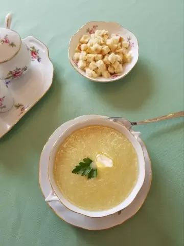 Теперь пришло время соединить бланшированный сельдерей с горячим консоме, после чего нарежьте картофель кубиками и добавьте в кастрюлю. Доведите все до кипения и варите с накрытой крышкой еще 15 минут, пока картофель не будет готов. После этого овощи вместе с бульоном нужно измельчить блендером. При необходимости вы можете процедить суп через сито, чтобы убрать нежелательные волокна сельдерея.