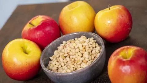 В глубокой миске смешать воду с 1 чайной ложкой сахара и соком лимона. Положить очищенные яблоки, чтобы они не потемнели.На сковороде растопить 30 г масла с 3 столовыми ложками сахара до образования карамели.Крупно нарезать яблоки, убрав семена, и поместить их на сковороду. Приправить солью и сбрызнуть лимонным соком (по желанию можно добавить корицу).Добавить лаванду и обжаренные кедровые орехи.Влить 50–70 мл чая и добавить шафран. Тушить в течение 2-3 минут.Переложить смесь в блендер, добавить оставшиеся 30 г сливочного масла и взбивать до получения однородного пюре.Перелить готовое пюре в баночку и хранить в холодильнике. Как правило, десерт исчезает в течение дня. Приятного аппетита!Источник: Шеф-повар Василий Емельяненко