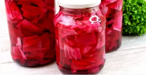 Разрезать капусту на четыре части, а затем нарезать кубиками. Свеклу нарезать четверть кольцами. В чистую банку слоями укладывать свеклу и капусту, добавив чеснок.