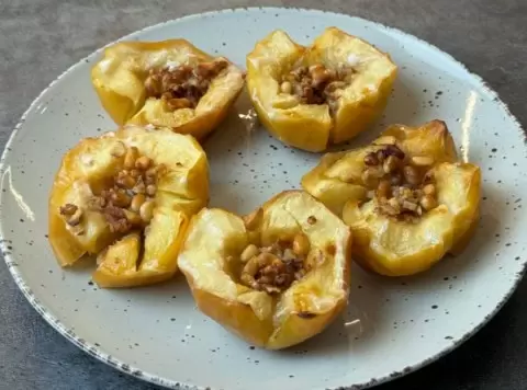 - Начинка. В образовавшиеся углубления кладется смесь орехов — грецких и кедровых. Можно дополнить медом, который при запекании карамелизуется и наполняет мякоть сладостью.